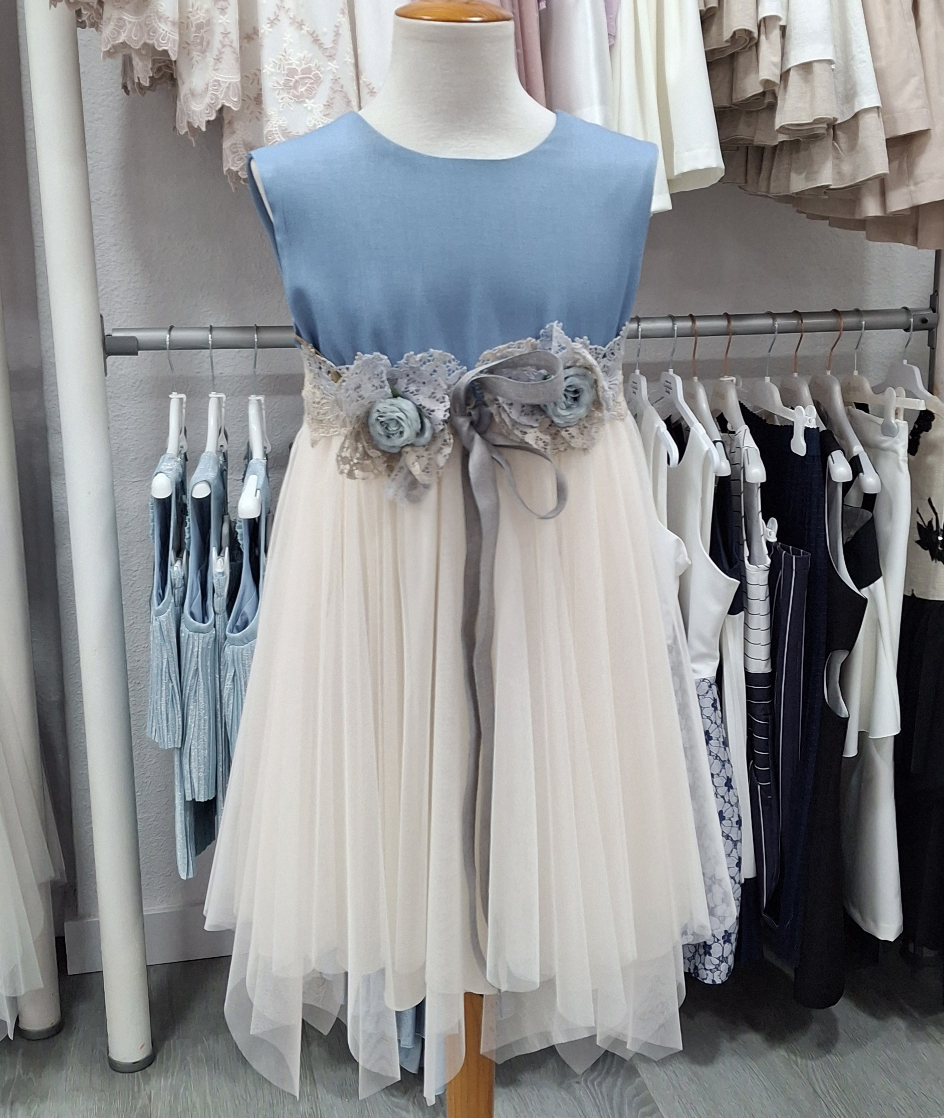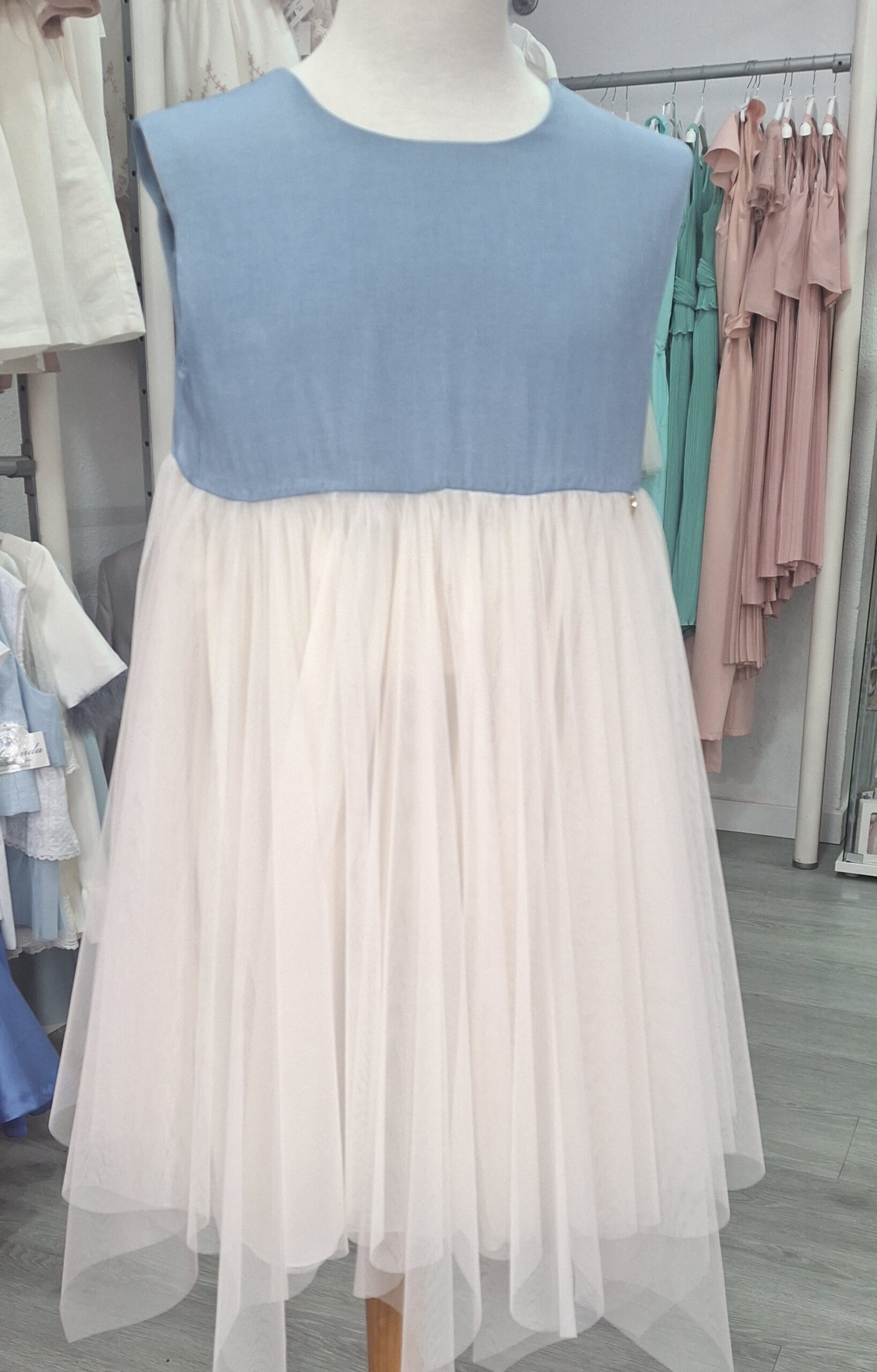 y la parte de la falda despuntada en tejido de tul color crudo .